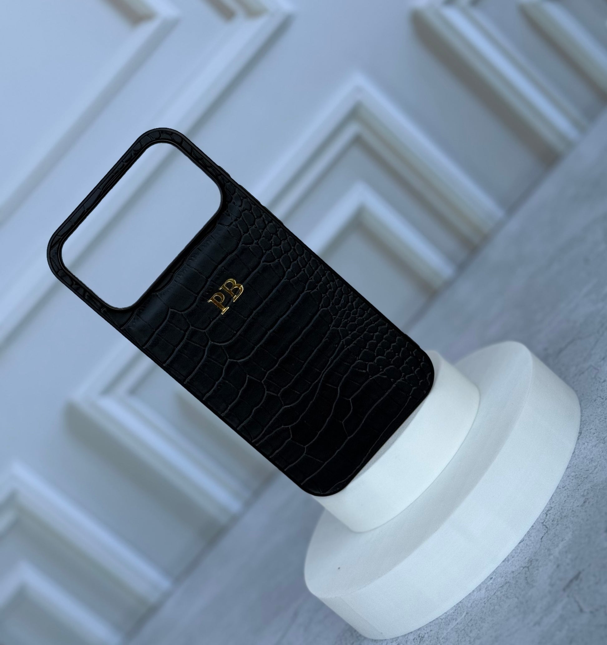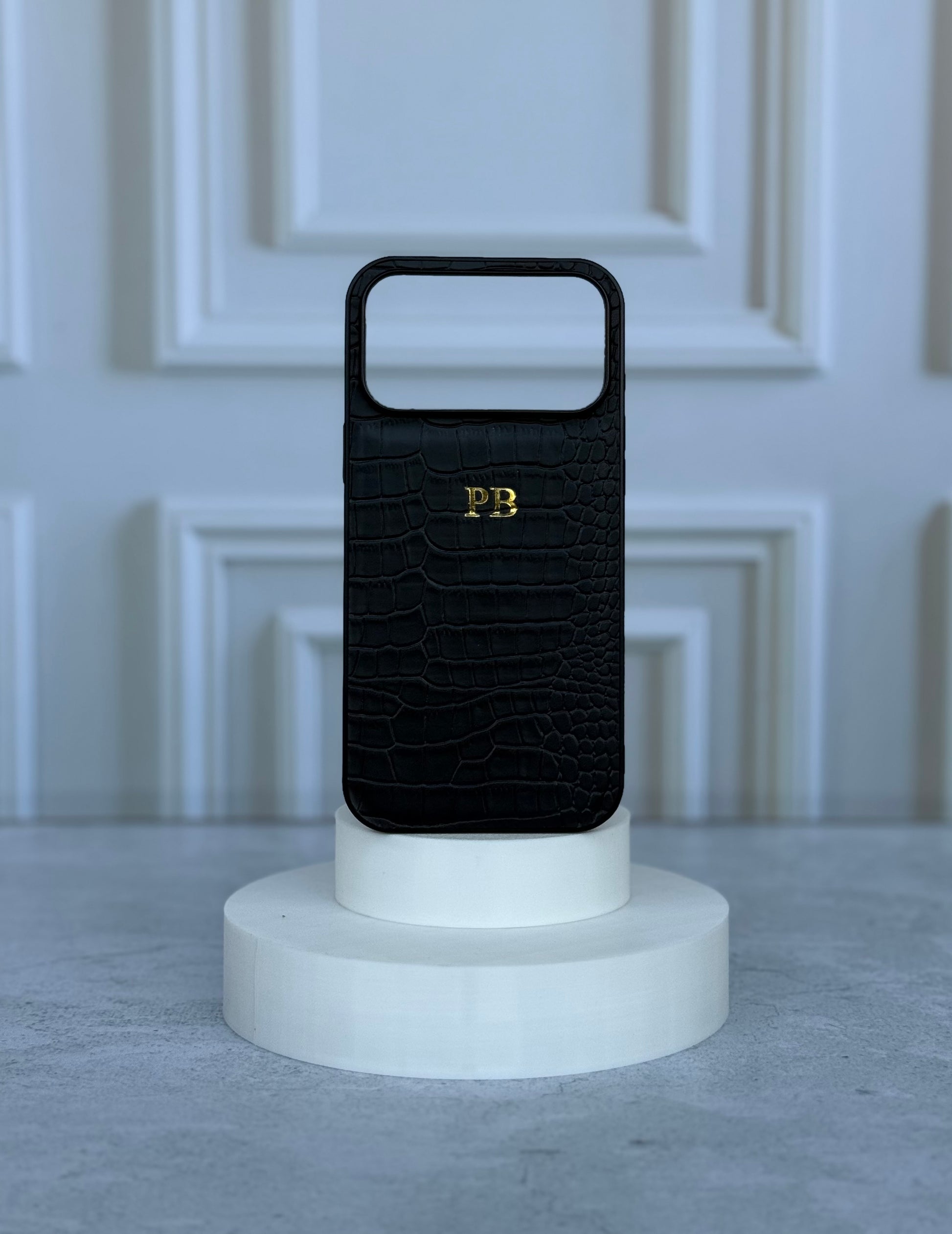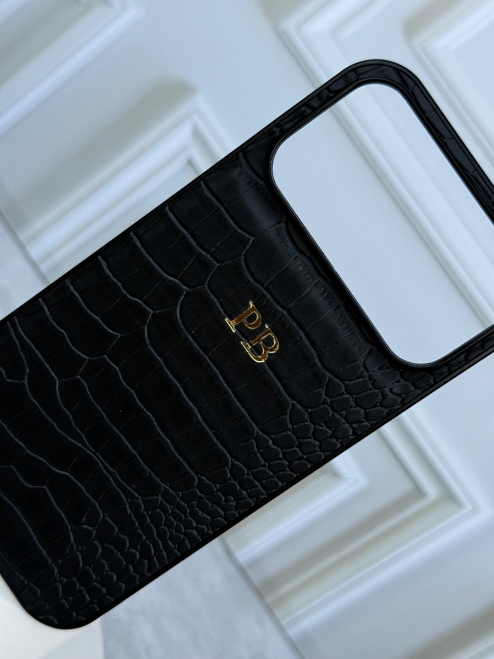 Case para iPhone negro mate, elaborado en cuero vegano, personalízalo con tus iniciales